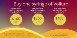 * Offers cannot be combined with other offers or gift cards; Bank your Botox valid 8/2/17-8/4/17 only, Bank your Botox cannot be combined with any other offers except Brilliant Distinctions Points, Minimum purchase of 100 units, Maximum purchase of 200 units; Banked Botox must be redeemed by 12/31/2018; Vollure promotion valid through treatments scheduled 8/1/17 – 8/31/17 or while instant rebate forms supplies last; Must be or become a member of Brilliant Distinctions program; Friend referral bonus of 10 units of Botox to be used during your next Botox treatment, Referred friend must be new to the practice and purchase a minimum of 35 units of Botox by 8/31/17